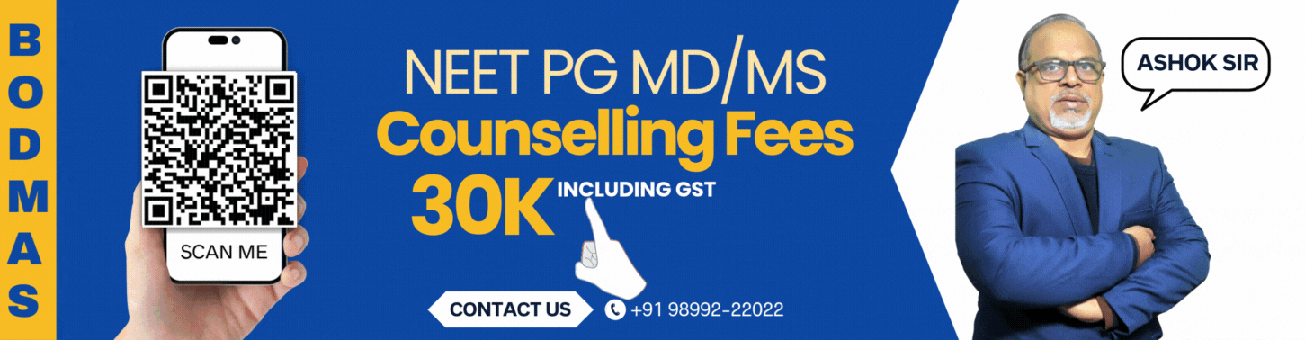Navigating the NEET PG admission procedure, picking the right institution, and understanding seat availability, fees, and counselling procedure can very often overwhelm aspirants. Bodmas Education Services is always prepared to guide medical aspirants needing help, through every single step of their PG journey. Our experts offer personalized counselling. We help in choosing right college and provide admission support. We also provide guidance related to education loans and scholarships. We provide all these services and more for a nominal fee of ₹30,000 (GST included).