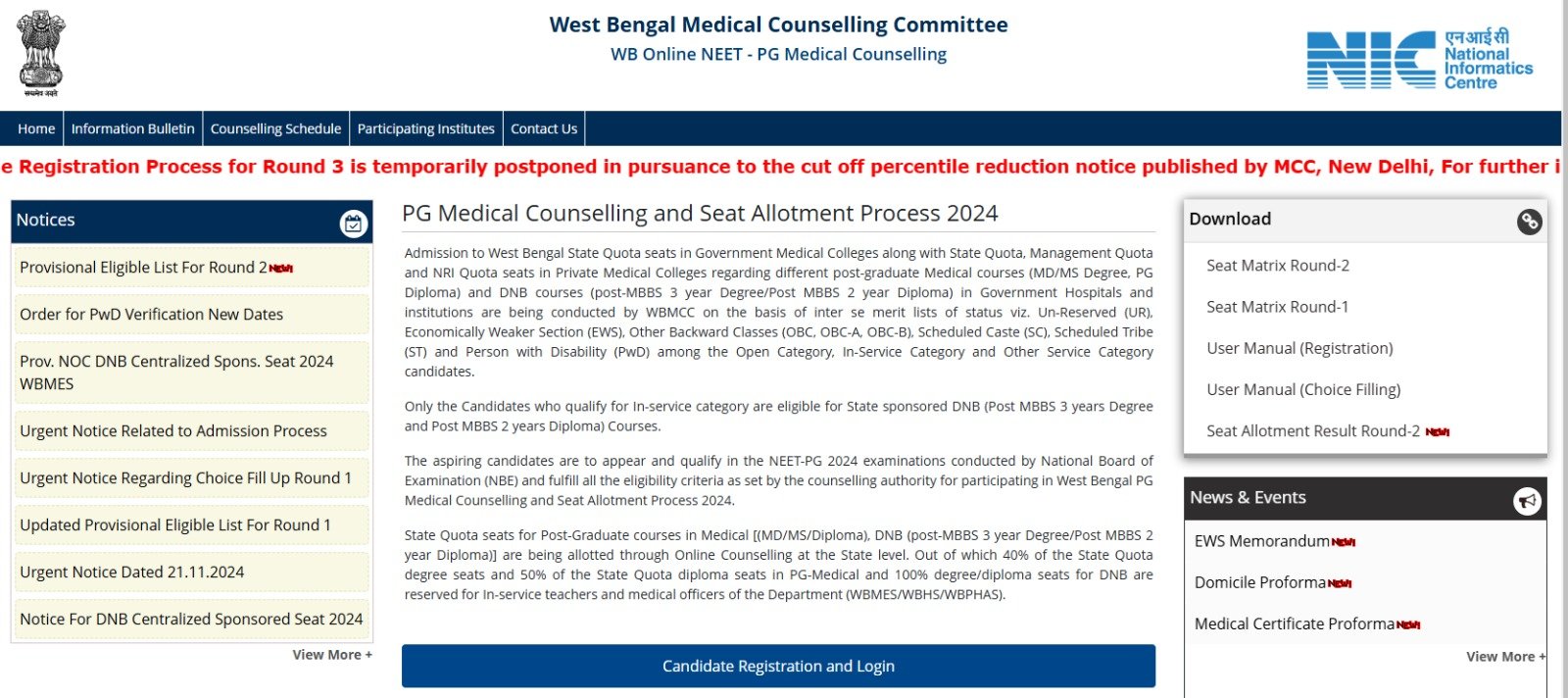 The Registration Process for Round 3 is temporarily postponed in pursuance to the cut off percentile reduction notice published by MCC, New Delhi, For further information please check counseling website frequently ...