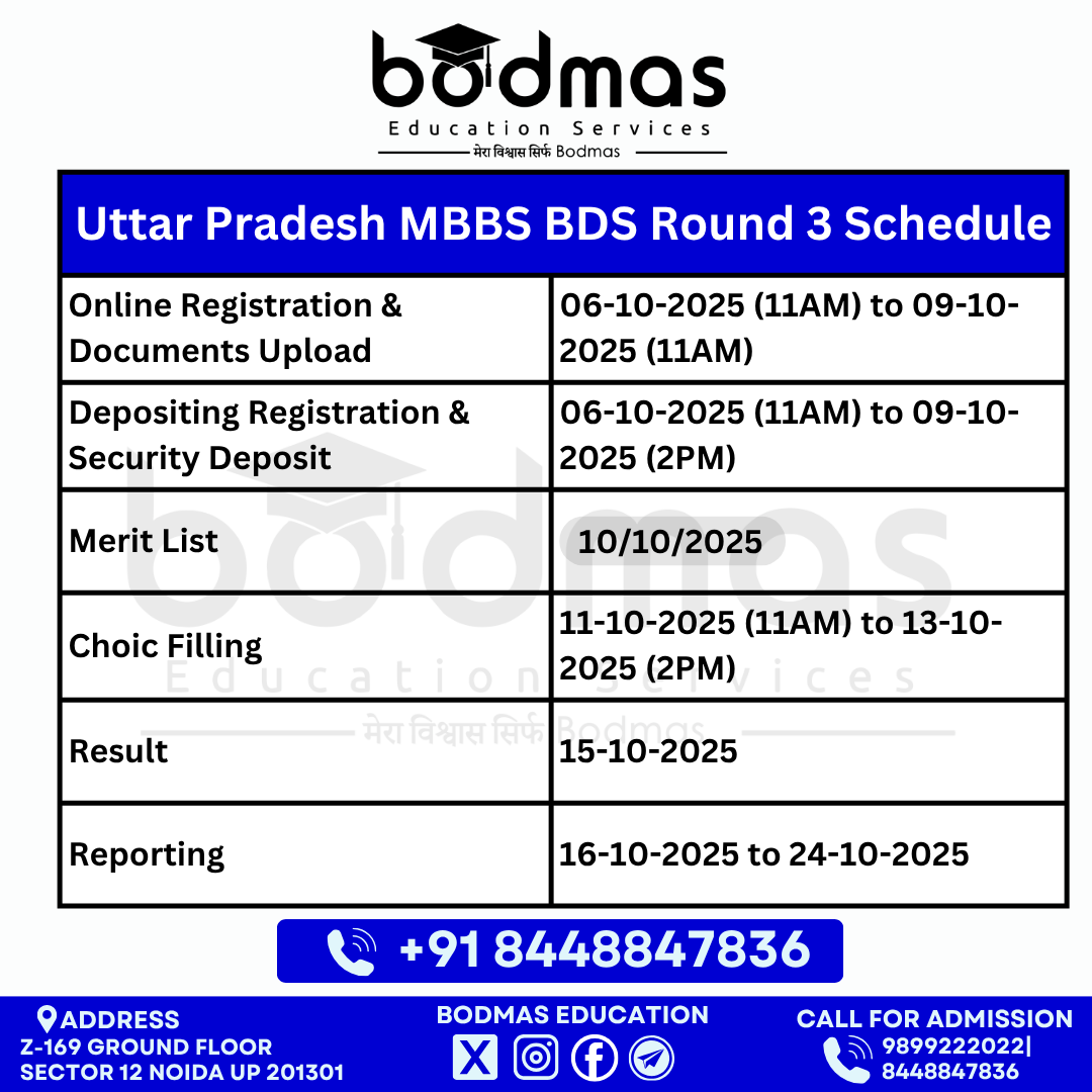 Uttar Pradesh MBBS BDS Round 3 Schedule 2025